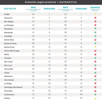 En matemática la situación es bien distinta. Solo siete provincias mejoraron su rendimiento con respecto a las pruebas ONE. En puntos porcentuales, la que más mejoró fue Jujuy (4 puntos arriba) y la de mayor caída fue Río Negro (11 puntos abajo). A diferencia del resto de las destacadas, Córdoba sí marcó un avance y se estableció en el segundo puesto.