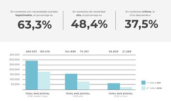 Para ello, los autores del informe se valieron del Índice de Contexto Social de la Educación (ICSE), que segmenta los territorios en los que están ubicados las escuelas en función de tres niveles de vulnerabilidad: bajo/medio, alto y crítico. Para determinar el ICSE se tienen en cuenta distintos factores como características de la vivienda, acceso al agua y saneamiento, educación formal de los padres, capacidad económica.