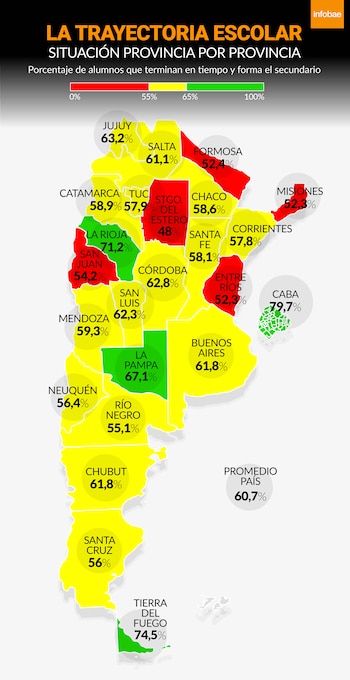 En la cohorte 2011-2016, la última de la cual hay datos disponibles, el 39,7% de los alumnos no llegó en tiempo y forma al último año de la secundaria, ya sea porque repitieron o abandonaron la escuela. En ese contexto de desgranamiento de la matrícula, las diferencias entre las estadísticas provinciales son muy grandes.