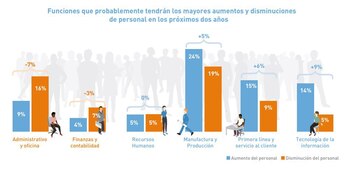 Pese al temor de pérdidas de trabajo por la automatización, el 86% de los empleadores planea mantener o aumentar su personal en los próximos años. Manufactura y Producción serán las industrias en las que habrá un mayor impacto, mientras que el trabajo administrativo y de oficina será el más reemplazable. En tanto, el 65% de las compañías que planea incrementar el personal en roles de Tecnología dice que la comunicación es la habilidad blanda más valorada.