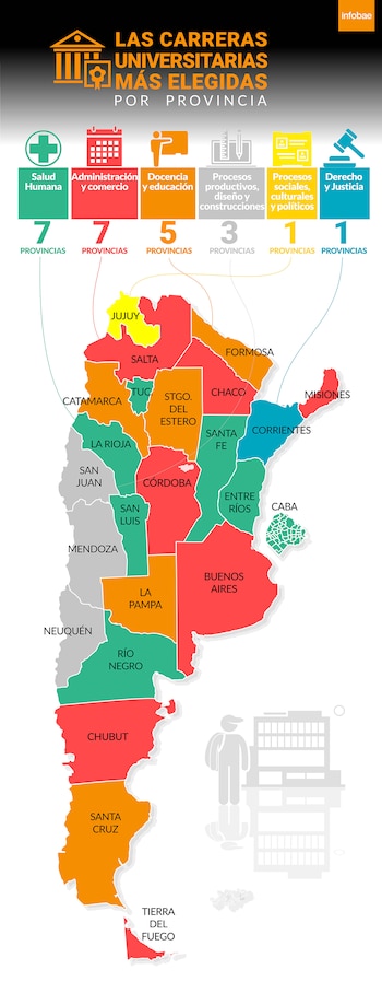 Las disciplinas vinculadas a Salud humana y Administración y comercio son las que mayor presencia nacional tienen en el sistema universitario. De un lado, carreras como medicina, farmacia, odontología. Del otro, contador público, administración de empresas, recursos humanos. Ambos campos de formación son los más elegidos en 7 provincias argentinas.