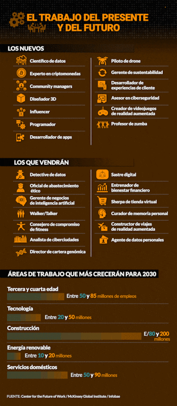 La tercera y cuarta edad será una de ellas. Se estima que en 2030 habrá 300 millones más de personas de 65 años o más, por lo cual en servicios médicos y acompañamiento habrá entre 50 y 80 millones de nuevos empleos. La tecnología traerá entre 20 y 50 millones de trabajos que, aseguran, serán muy bien remunerados. La construcción también se potenciará con más trabajo para arquitectos, ingenieros, electricistas, carpinteros.