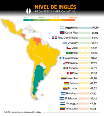 De las regiones analizadas, Latinoamérica es la única que tuvo una leve reducción en su puntaje. El dominio de inglés es "débil", pero sigue siendo el más "uniforme". Entre el primero y el último hay solo 11 puntos de diferencia. "Los sistemas educativos de bajo rendimiento y los altos niveles de desigualdad económica han dificultado los esfuerzos por mejorar el dominio del inglés en la región", sostiene el informe.
