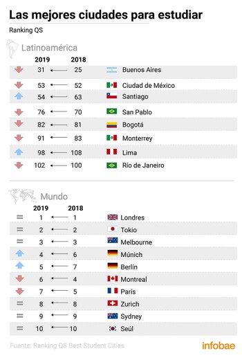 Buenos Aires se consolidó una vez más como la mejor ciudad de Latinoamérica para estudiar, de acuerdo a un índice global. La sexta edición del ranking de la consultora británica Quacquarelli Symonds (QS), sin embargo, muestra una pequeña caída respecto al año anterior: pasó del puesto 25 al 31 del mundo.