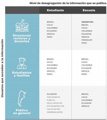 En Brasil, Chile, Colombia, Ecuador, México y Perú la información es pública. Las familias pueden acceder y comparar el presunto nivel educativo de cada institución, lo que imprime una lógica de competencia. Incluso las evaluaciones que se toman a nivel nacional son con nombre y apellido. Eso se debe, en parte, porque en algunos países hacen un examen al final del secundario, cuya nota abre o cierra puertas en la universidad.