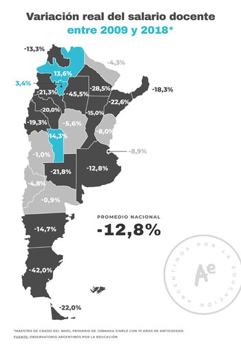 En casi todo el país, el salario de los docentes perdió contra la inflación que se registró entre 2009 y 2018, los últimos datos disponibles. Los sueldos de los educadores argentinos cayeron en promedio 12,8% en esos diez años.