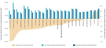 En 21 provincias, la variación nominal del salario fue inferior a la variación de los precios en la década analizada. Las mayores caídas se registraron en Santiago del Estero (-45,5%) y Santa Cruz (-42,0%), aunque esta última tiene un sueldo promedio de más del doble que la primera. Después, entre las que más perdieron, siguen Chaco (-28,5%), Corrientes (-22,6%), Tierra del Fuego (-22,0%), La Pampa (-21,8%), Catamarca (-21,3%) y La Rioja (-20,0%).