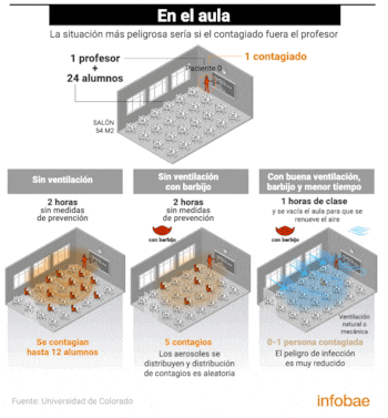 De acuerdo con un modelo desarrollado por José Luis Jiménez, un investigador de la Universidad de Colorado, la situación más riesgosa se daría en un aula sin ventilación, en la que la persona infectada fuera el docente. Si pasaran dos horas de clase con un maestro enfermo, sin tomar ninguna medida contra los aerosoles, la probabilidad de contagio alcanzaría hasta a 12 alumnos. Si todos llevaran tapabocas, solo cinco se podrían contagiar. Si además se ventilara durante la lección (de forma natural o mecánica) y se parara después de una hora para renovar el aire, el riesgo se desplomaría.