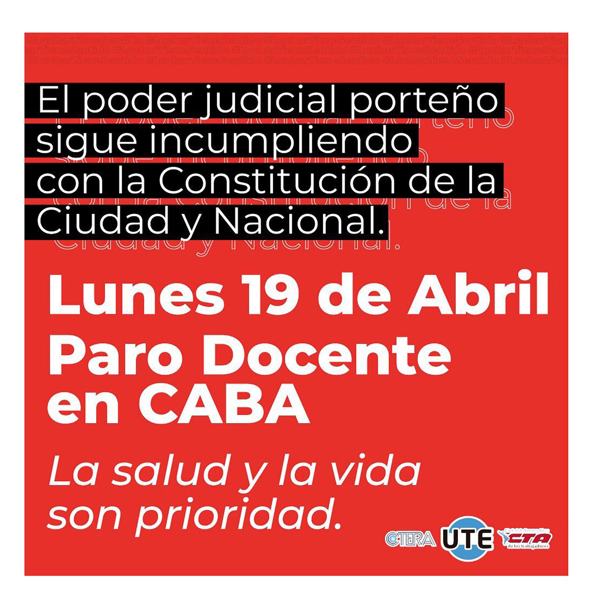 Sindicatos docentes llamaron a un paro para este lunes 19 de abril tras la decisión de la Cámara de apelaciones de volver a clases presenciales. “Si la Justicia viola la Constitución, PARAMOS en la ciudad de Buenos aires”, arranca el comunicado que emitió la Unión de Trabajadores de la Educación (UTE) luego de que los jueces Marcelo López Alfonsín, Laura Alejandra Perugini y Nieves Machiavelli, ordenaron habilitar mañana las clases presenciales en CABA, en detrimento del Decreto de Necesidad y Urgencia (DNU) firmado por el presidente Alberto Fernández.
