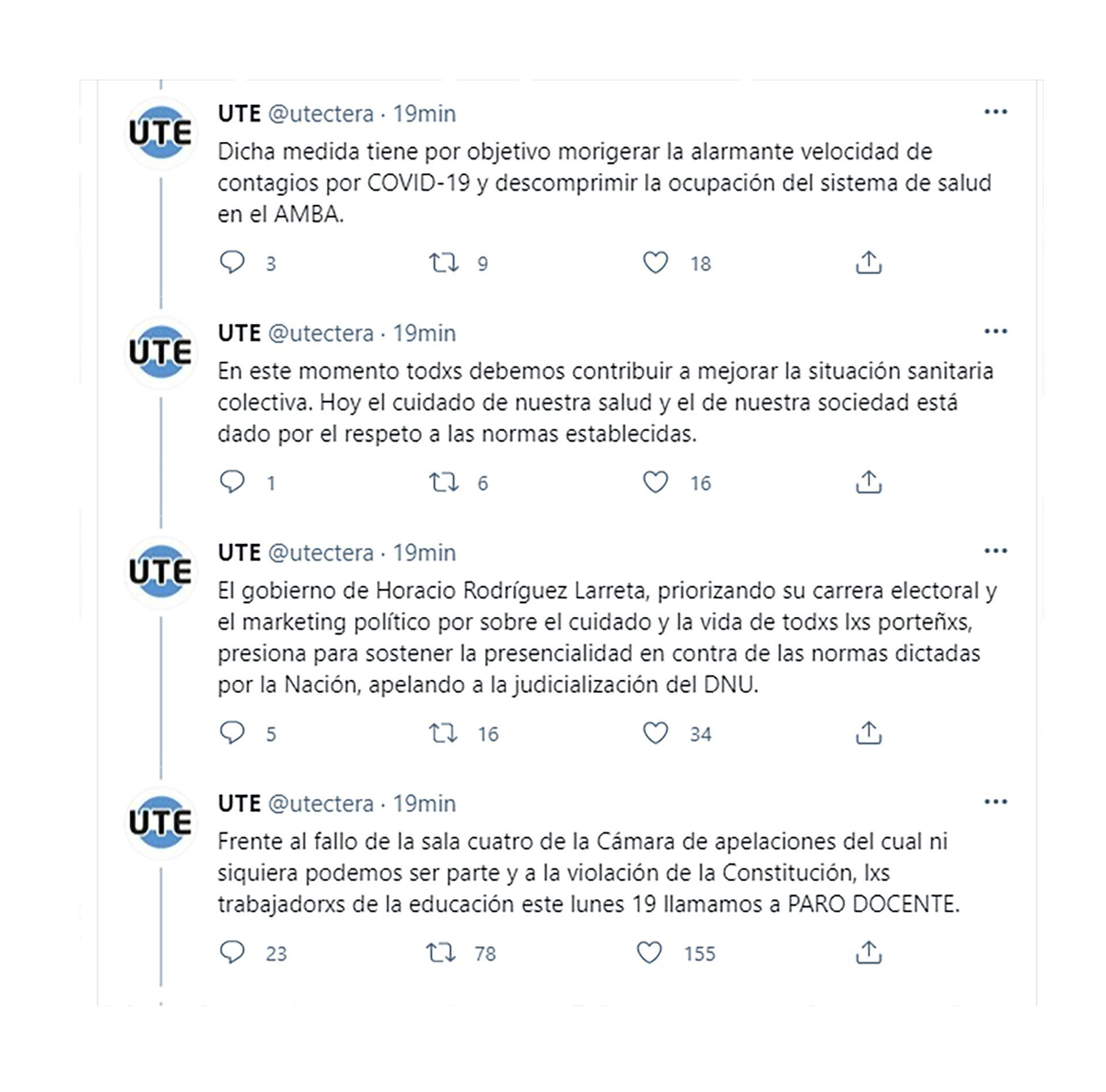 Desde las redes sociales de UTE-Ctera, también se manifestaron al respecto. A través de un extenso hilo de tuits, dejaron en claro su postura. “En las escuelas siempre enseñamos a respetar el orden de prelación de las leyes, la Constitución Nacional y el pleno ejercicio de la democracia en el marco del Estado de Derecho. El día jueves el Poder Ejecutivo Nacional emitió el Decreto de Necesidad y Urgencia 241-APN-PTE, en el marco de la Emergencia Pública Sanitaria declarada por la Ley 27541 que, entre otras medidas, establece la suspensión temporal de clases presenciales durante 15 días en el AMBA”, explicaron.