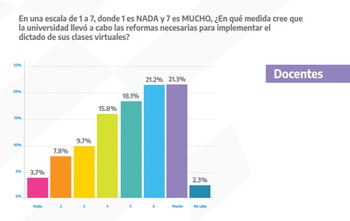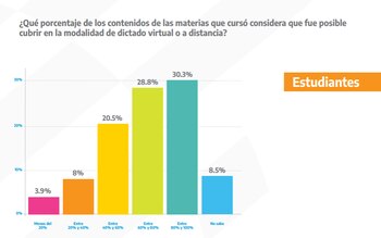 El 99,5% de los docentes debió transformar el dictados de sus materias a la modalidad virtual y el 87% señaló que pudo cumplir con los objetivos propuestos. 6 de cada 10 profesores dijo haber logrado cubrir entre el 80% y el 100% de los contenidos de su materia, mientras que un 23,8% declaró haber cubierto entre el 60% y el 80% de lo planificado antes de la pandemia. Los profesores se pudieron sobreponer a las dificultades tecnológicas ya que 4 de cada 10 manifestó que no tiene una computadora de uso exclusivo en su casa. Entre los estudiantes, la consideración de cuántos contenidos se lograron cubrir fue dispar.