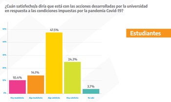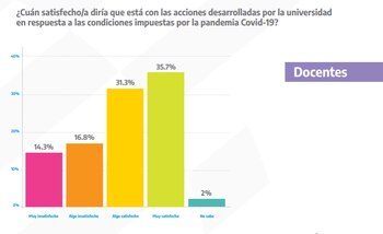 Lo que surge de las encuestas es que la gran mayoría de autoridades, personal y estudiantes está satisfecho con la respuesta a la pandemia que dio la universidad. Casi 7 de cada 10 docentes encuestados (67%) respondió que estaban “satisfechos” y “muy satisfechos”. En la misma sintonía, los estudiantes y trabajadores no docentes manifestaron similar o aún mayor conformidad (72% los primeros y 76% los segundos)