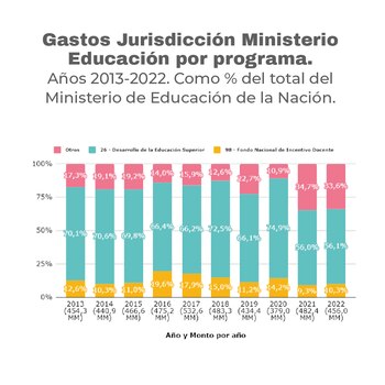 Más de la mitad del presupuesto educativo de Nación corresponde a las universidades. Y la baja interanual se explica, en parte, por la caída en el nivel superior. Dentro del proyecto de ley, tres de cada cinco pesos se destinarán a dos programas: Desarrollo de la Educación Superior (56,1% del total) y Fondo Nacional de Incentivo Docente (10,3%). Según el análisis del informe, ambos programas tienen en 2022 un peso relativo menor que en años anteriores. El primero representó 74,9% del gasto del Ministerio en 2020 y 56,0% en 2021. El segundo era de 14,3% en 2020 y de 9,3% en 2021.