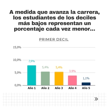 Asimismo, más allá del ingreso a la universidad, las cifras reflejan grados muy distintos de continuidad durante la carrera que también se vinculan al nivel socioeconómico. En el primer año, los estudiantes de menores ingresos (decil 1) representan el 7,9% del total de alumnos, mientras que en el quinto año representan el 1,1% del total. En contraste, en el primer año, los jóvenes de mayores ingresos (decil 10) representan el 5,3% de la matrícula y alcanzan el 12,7% en el último año.