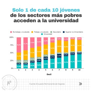 Entre los jóvenes de los sectores más pobres de la Argentina, tan solo uno de cada diez (12,4%) llega a la universidad. La brecha es enorme: en el decil de mayores ingresos de la población, casi la mitad de los argentinos entre 19 y 25 años estudia una carrera universitaria. La disparidad se ensancha aún más, a su vez, si se mira la permanencia durante la cursada.