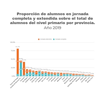 Según un informe del Observatorio Argentinos por la Educación, Tierra del Fuego es justamente la provincia más cerca de universalizar la jornada extendida que por ley es obligatoria desde 2006. El 81,4% de los alumnos de primaria tiene más de cuatro horas de clase. Están muy lejos del segundo distrito, que es la Ciudad de Buenos Aires, con una cobertura del 45,8%. Ni hablar de la jurisdicción más relegada, Santa Cruz, que solo alcanza al 2% de los chicos.