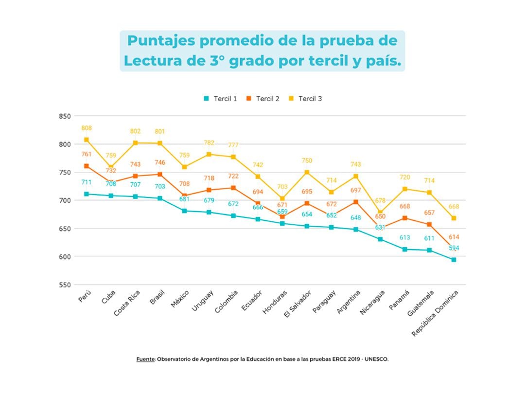 Los datos surgen de un nuevo informe del Observatorio de Argentinos por la Educación, con autoría de Guillermina Tiramonti (FLACSO), Eugenia Orlicki y Martín Nistal (Observatorio). El estudio analiza los resultados del Estudio Regional Comparativo y Explicativo (ERCE) 2019 de lectura en tercer grado de Argentina en comparación con el resto de los países latinoamericanos y por nivel socioeconómico. En la prueba ERCE, coordinada por UNESCO, participaron 16 países de la región.