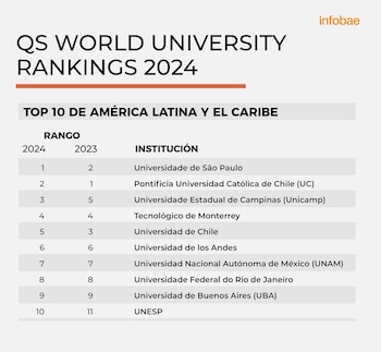 Entre las 100 mejores instituciones de educación superior de América Latina también figuran la Universidad Torcuato Di Tella (puesto 45), Universidad Nacional de Rosario (65), Universidad de San Andrés (67), Universidad Nacional de Cuyo (81), Instituto Tecnológico de Buenos Aires (93), Universidad de Belgrano (97) y Universidad de Palermo (100).
