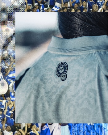 En una de las imágenes promocionales, tres jóvenes posan con la camiseta principal de la selección. Los tres visten una prenda azul con detalles en un tono azul más oscuro en los costados y el cuello.