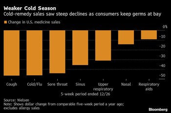 Sales of cold, flu and cough medicine in the U.S. plummeted 46% in the five weeks ended Dec. 26 from the same period last year, according to data from market research firm Nielsen. Procter and Gamble Co., which owns the Vicks and NyQuil medicine brands, said the drop in run-of-the-mill stuffy noses and sore throats partially offset the otherwise strong quarter for its health-care segment.
