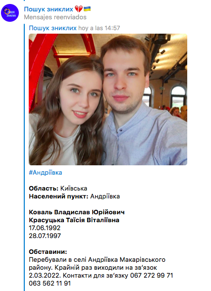 Mykola and Yulia wrote these testimonies two days later, when they managed to cross the border into Poland. On the same Telegram site there are already more than 60,000 posts of relatives looking for theirs. Another hundred orders come in per hour. They need to know if their parents, siblings or children are alive. It's getting harder to find an answer every minute. Victims increase exponentially. The networks are collapsed. The Russians confiscate every phone they find.
