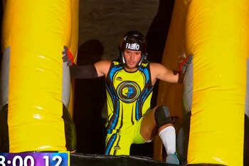 Fabio Agostini was selected to be the first competitor to pass the 'vacuum jump' game, which consisted of climbing to the top of an inflatable game and then jumping.