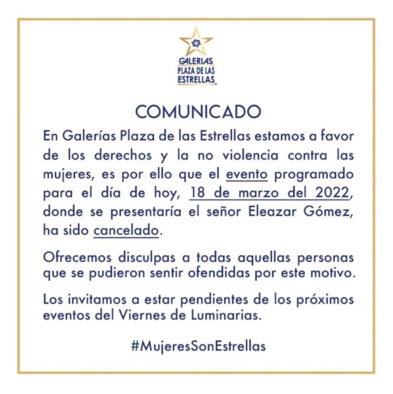 Organizers of Gallerias Plaza de las Estrellas released a statement in which they apologize for promoting an event in which Eleazar Gómez would be recognized and announced the cancellation of it.