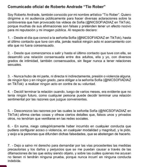 TikTok soon went viral on social networks, where some users asked that the alleged abuse be investigated and demanded that the presentation of Tío Rober be canceled, as part of Happy Hour, at Vive Latino 2022. After the controversy that broke out, Roberto Andrade issued a press release in which he flatly denied the allegations of the one who said, is his ex-girlfriend, and assured that there was never any violence.