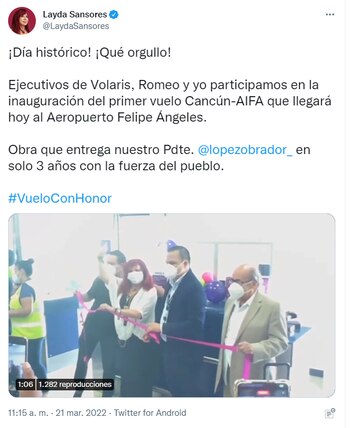 In the same way, he said: “Historic day! What pride! Volaris executives, Romeo and I participated in the inauguration of the first Cancun-Aifa flight that will arrive today at Felipe Angeles Airport. Work delivered by our Pdte. @lopezobrador_ in just 3 years with the strength of the people”.