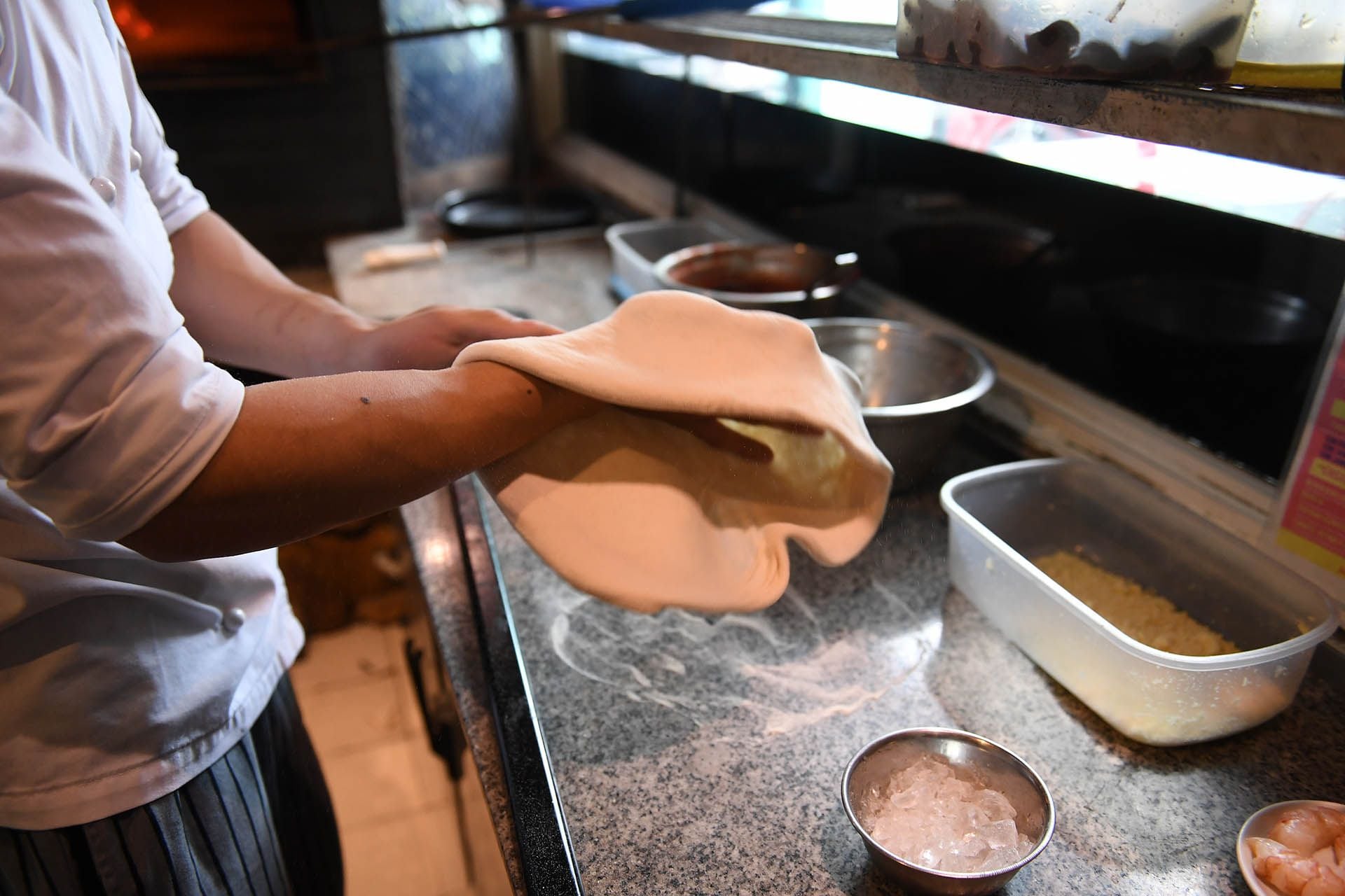 - When the buns are relaxed (they got warm) we begin to stretch them, always on a floured surface to be able to handle our buns well trying to form the pizza.