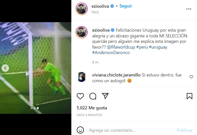 The singer posted on his Instagram a video of the precise moment of the own-goal and a series of photographs accompanied by a message congratulating Uruguay on his victory, but asking if anyone can give him an explanation as to why the referee did not review the VAR.