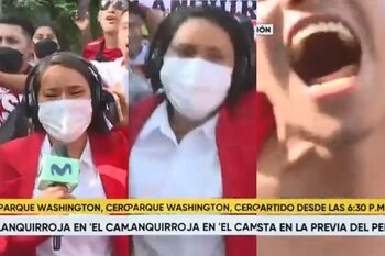 The reporter tried to start her work live, but fans of the Peruvian national team began to sing the songs of aliento a la bicolor. The screams and excitement took hold of the journalist, she began to jump and sing along with the fans.
