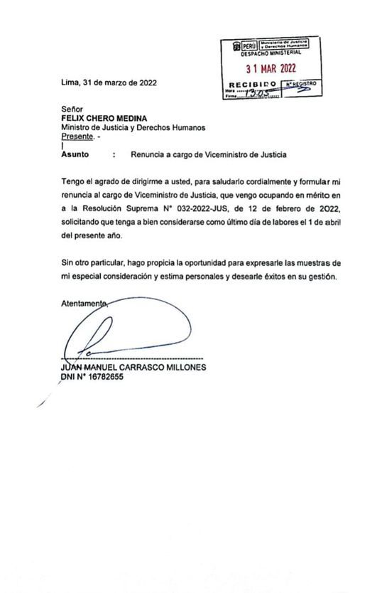 On Friday, April 1, former prosecutor Juan Carrasco Millones presented his letter of resignation from the post of Deputy Minister of Justice at the Ministry of Justice and Human Rights (Minjusdh) ). The former Minister of Defense addressed the current holder of the portfolio, Felix Chero Medina, to ask him to consider that same Friday as his last day in functions.