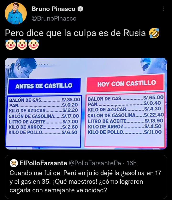 Bruno Pinasco used his Twitter account to refer to the situation facing the country with rising prices. As you recall, President Pedro Castillo pointed out that this is due to Russia's invasion of Ukraine. The president clarified that it is not possible to intervene, since it is not the fault of the Government.