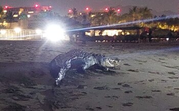 A crocodile measuring approximately three meters caught by surprise several people who were on the beach of Nuevo Nayarit on the night of this Saturday, April 16.