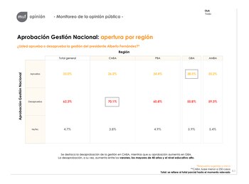 Según el estudio de opinión, el 62,3% de la población desaprueba el gobierno del Frente de Todos, mientras que solo un 33% lo aprueba. El ofiicialismo tiene la situación más adversa en la Ciudad Autónoma de Buenos Aires, donde la desaprobación escala al 70,1%, mientras que en territorio bonaerense llega al 60,8%.