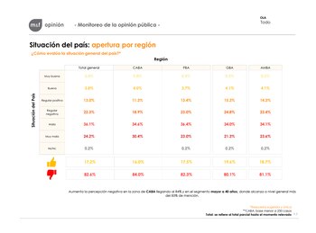 Consultados sobre cómo evalúan la situación general del país, la mayoría de los argentinos consideró que es regular negativa, mala o muy mala: esos tres conceptos suman el 82,6%, mientras que solo el 17,2% cree que es regular positiva, buena o muy buena.