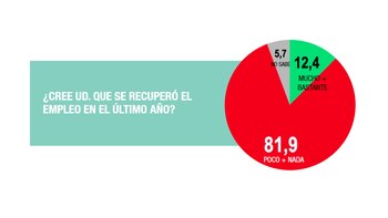 “¿Usted cree que se recuperó el empleo en el último año?”, fue otra de las preguntas. Un 12,4% respondió “mucho” o “bastante”; un 81,9% “poco” o “nada” y un 5,7% “no sabe”.