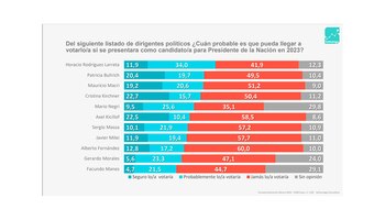 Ante la pregunta de “¿Cuán probable es que pueda llegar a votarlo/a si se presentara como candidato/a para Presidente de la Nación en 2023?”, la mayoría de las encuestados contestaron a favor del alcalde de la CABA, con el 45,8% de las respuestas afirmativas. Detrás del jefe de Gobierno porteño lo siguen, en orden de preferencias, la presidenta del PRO, Patricia Bullrich (40,1%); y el ex presidente Mauricio Macri (39,8%). Recién en cuarto lugar aparece Cristina Kirchner, con el 38,4% de las respuestas afirmativas, a pesar de que anunció que no competiría en las elecciones presidenciales de 2023 a raíz de la condena en la causa de “Vialidad”, un fallo de primera instancia que, si se confirma, la inhabilita a ejercer cargos públicos de por vida.