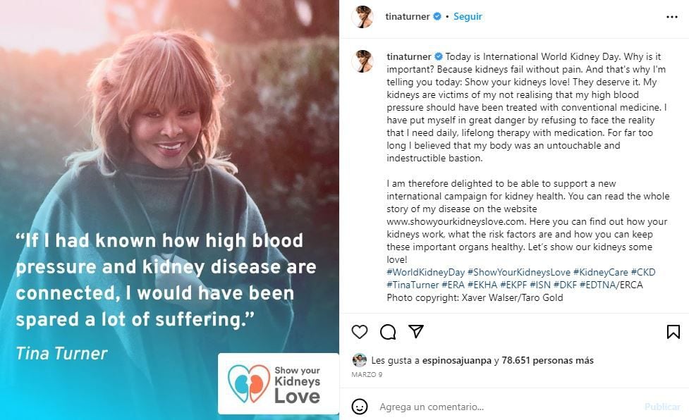 Dos meses antes de morir, Tina Turner confesó cómo era su batalla contra la enfermedad renal que padecía. “Mis riñones son víctimas de no darme cuenta de que mi presión arterial alta debería haber sido tratada con medicina convencional”, escribió en su cuenta Instagram.