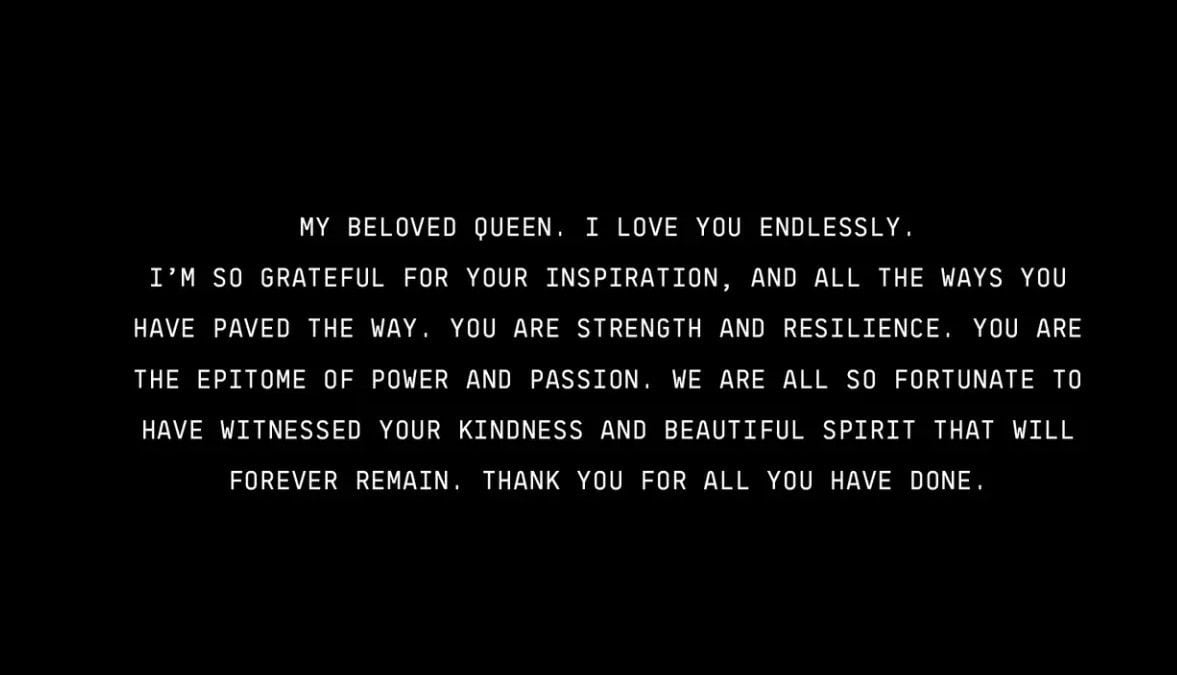 “Mi amada reina, te amo infinitamente. Estoy muy agradecida por tu inspiración y por todas las formas en las que has allanado el camino. Eres fuerza y resistencia. Eres la personificación del poder y la pasión. Todos somos tan afortunados de haber sido testigos de tu bondad y de tu hermoso espíritu que permanecerá para siempre. Gracias por todo lo que has hecho”.
