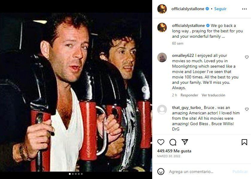 A finales de 2022, Stallone confesó a The Hollywood Reporter sentirse muy triste por no tener contacto con Bruce Willis, además, aseguró en su redes sociales que se encontraba orando por él y su familia en estos momentos difíciles.