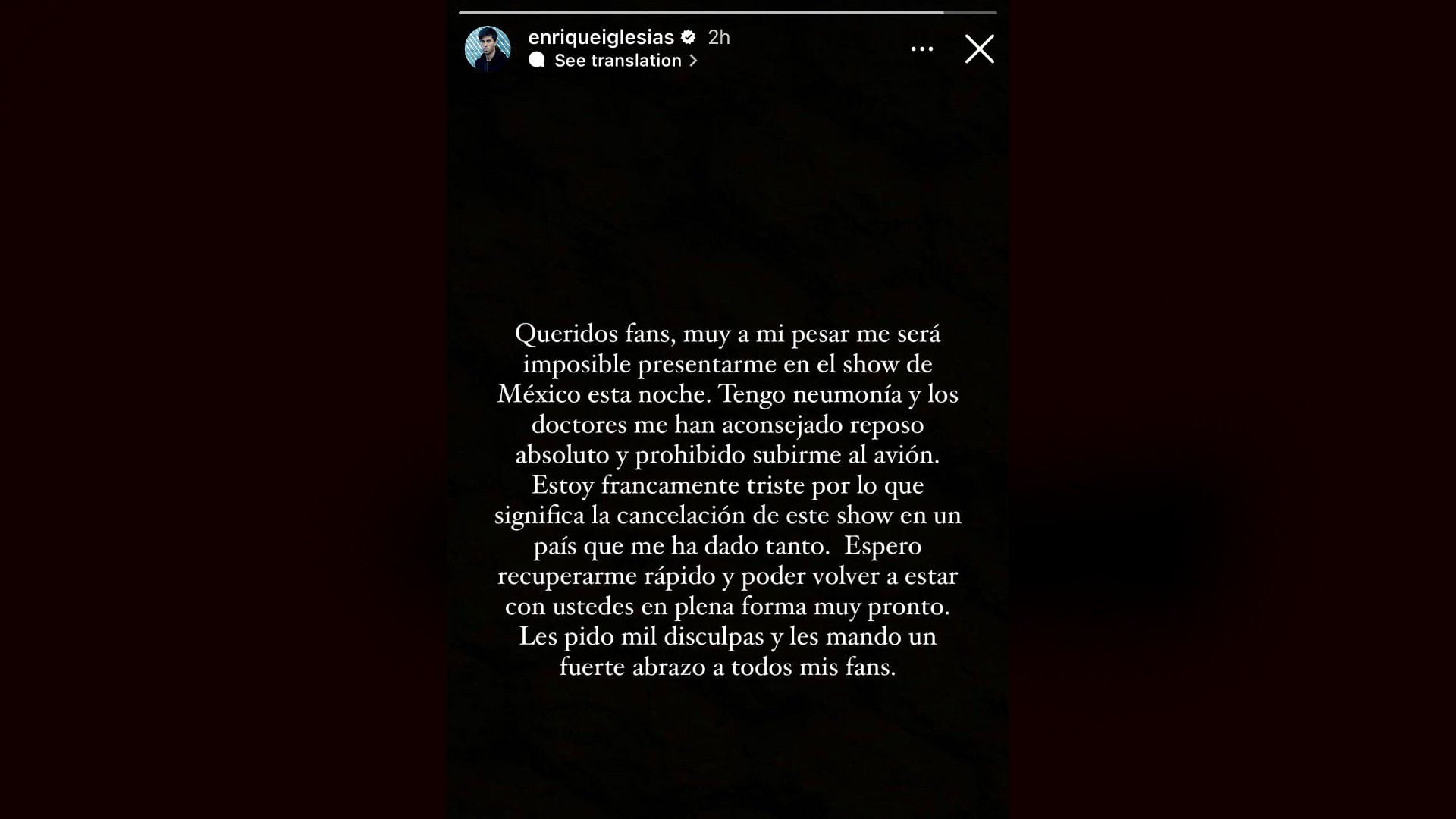 “Queridos fans, muy a mi pesar me será imposible presentarme en el show de México esta noche. Tengo neumonía y los doctores me han aconsejado reposo absoluto y prohibido subirme al avión”, explicó en un mensaje que dio a conocer en una de sus historia de su cuenta de Instagram y su Twitter.