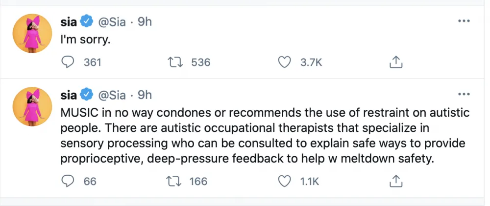 La revelación ha causado un gran impacto entre los fanáticos de la cantante debido a que en 2021, Sia dirigió, produjo y escribió la cinta Music. Esta cuenta la historia de Kazu “Zu” Gamble (Kate Hudson), una traficante de drogas que debe cuidar a su media hermana, Music Gamble, quien es una autista no verbal. Music fue interpretada por Maddie Ziegler, actriz y bailarina que ha colaborado en muchos videoclips de Sia pero que no se encuentra dentro del espectro autista, lo que causó el descontento de esta comunidad.