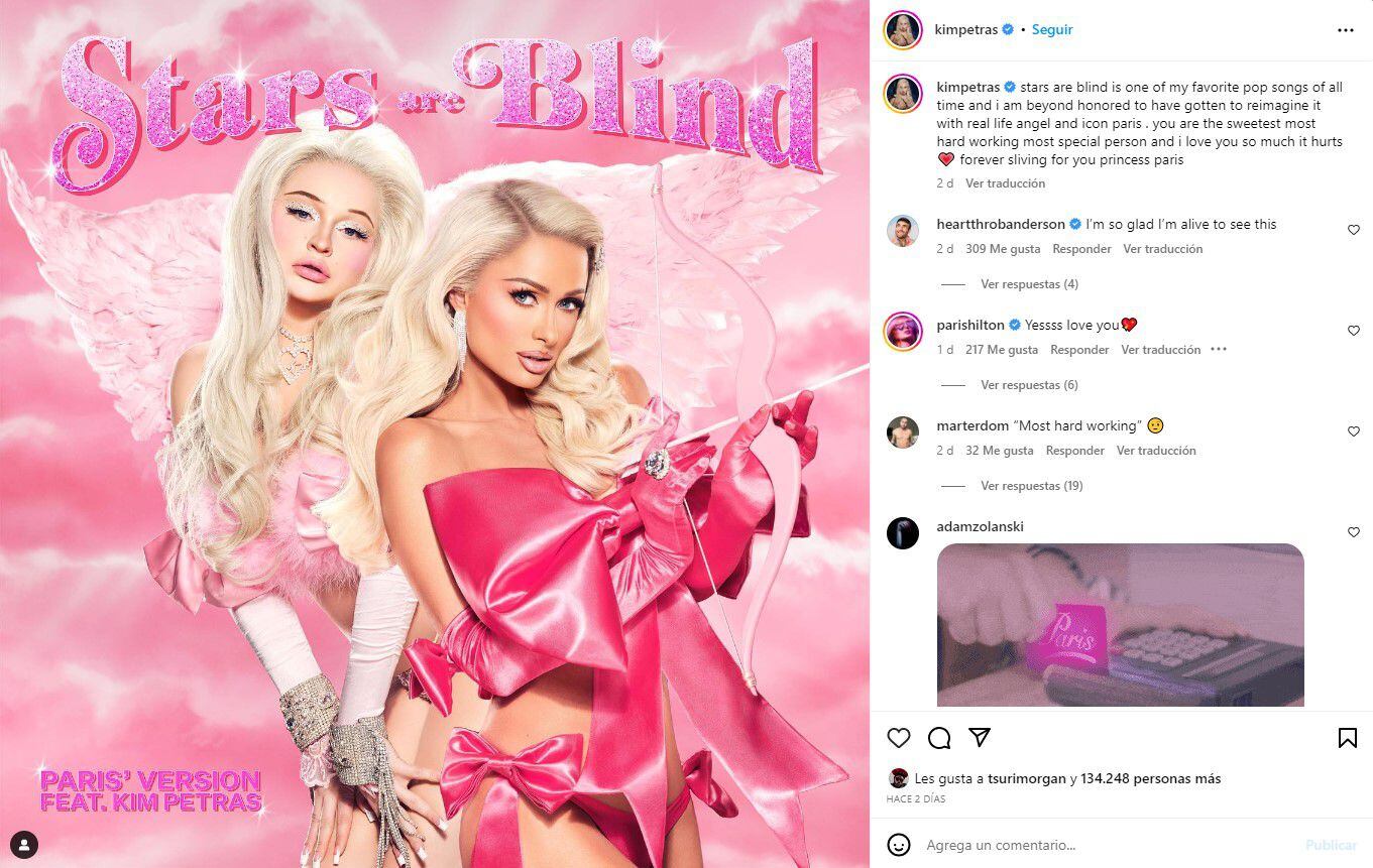 “Estoy muy emocionada de compartir que mi nueva versión de Stars Are Blind con mi hermana y querida amiga Kim Petras ya está disponible en todas las plataformas de streaming. Desde que Kim cantó esta canción en mi boda, supe que teníamos que grabar una versión oficial con ella”, declaró Paris Hilton en su Instagram oficial.