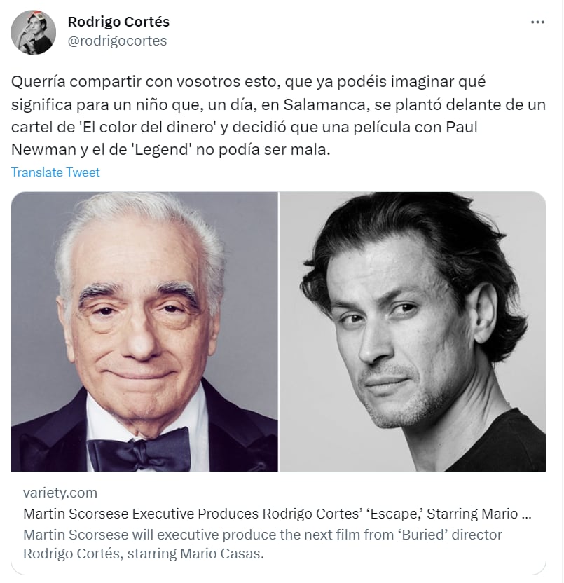 “Ya podéis imaginar qué significa para un niño que, un día, en Salamanca, se plantó delante de un cartel de El color del dinero y decidió que una película con Paul Newman y el de Legend no podía ser mala”, ha señalado Cortés en su cuenta personal de Twitter tras la confirmación de la noticia.