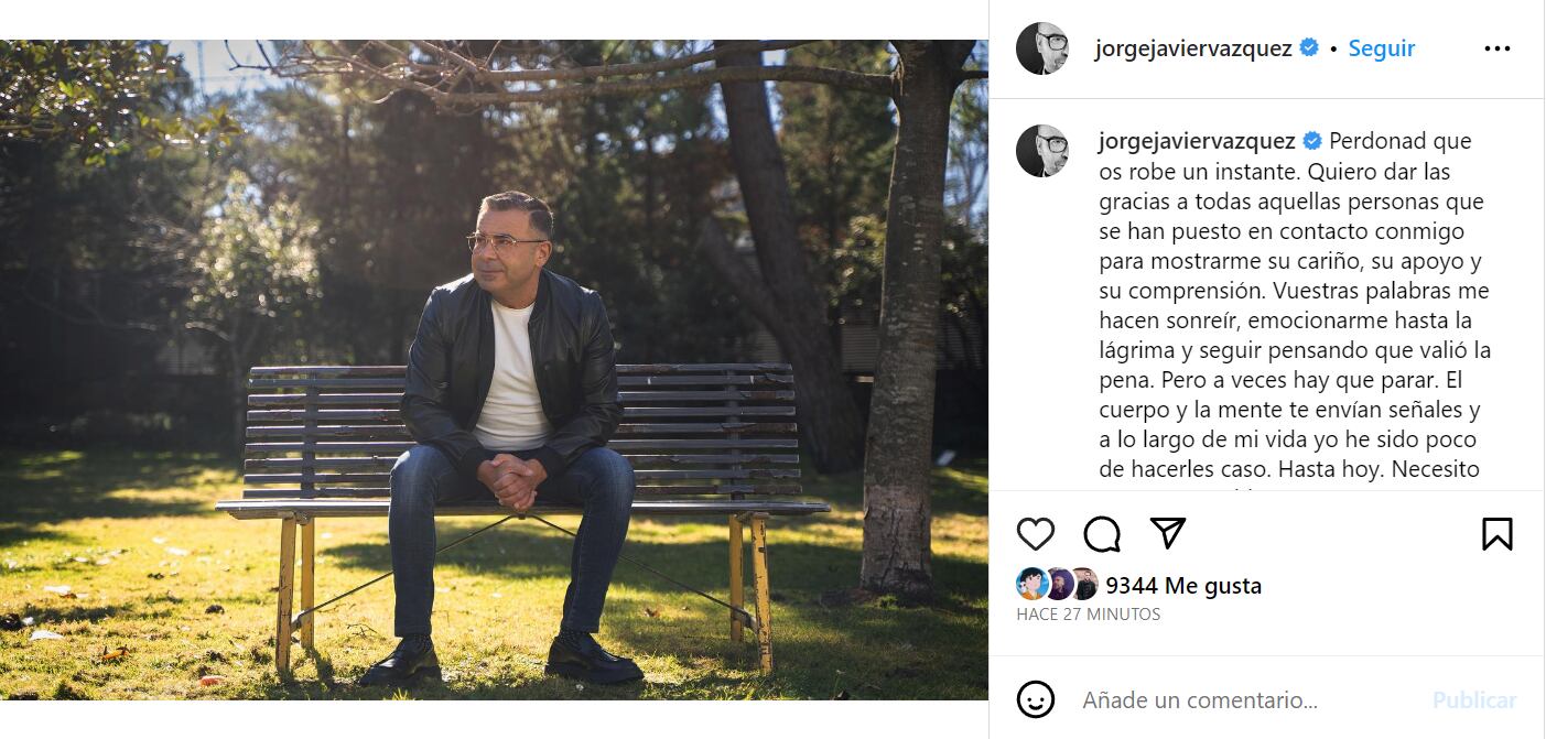 Jorge Javier Vázquez ha reaparecido este sábado 3 de junio en sus redes sociales tras más de dos semanas ausentado de su puesto de trabajo por una baja médica. El presentador de Sálvame ha publicado un mensaje en el que agradece el cariño recibido en estos días, aunque también siembra la duda sobre su regreso a Mediaset con varias frases que suenan a despedida.