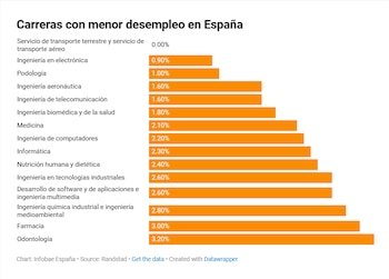 Un estudio realizado por Randstand para la Universidad CEU San Pablo titulado Jóvenes universitarios y empleabilidad. Cualificación, profesiones en auge y transición laboral identifica cuáles son las carreras universitarias que mayor y menor tasa de desempleo sufren.