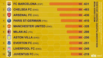 El Observatorio de Fútbol CIES ha elaborado un ranking de clubes de todo el planeta que refleja gastado e ingresado en materia de fichajes y traspasos en la última década. El Barcelona encabeza la lista con 631 millones de euros. Le sigue el Chelsea con 483; Arsenal 436; PSG 410 y Manchester United cuyo déficit es de 328 millones de euros. La situación económica refleja la dura realidad de un equipo cuya época histórica en la que más dinero ha gastado está coincidiendo con la que menos éxitos deportivos cosecha.