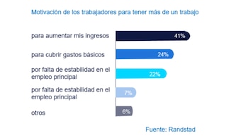 Apunta en la misma dirección una encuesta realizada por Randstad que recoge que más de la mitad de los trabajadores españoles (55%) ha compatibilizado en algún momento dos o más empleos a lo largo de su vida laboral y que, en la actualidad, uno de cada diez continúa compaginando varios trabajos, mientras que el 45% asegura no haberlo hecho nunca.